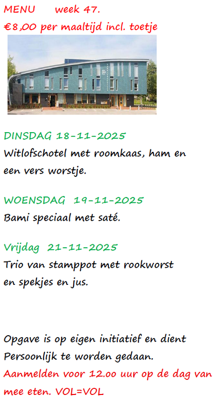 Aanmelden om te eten kunt u voor 12.00 uur doen van die zelfde dag. (Dit in verband dat de keuken moet weten voor hoeveel mensen er gekookt moet worden)