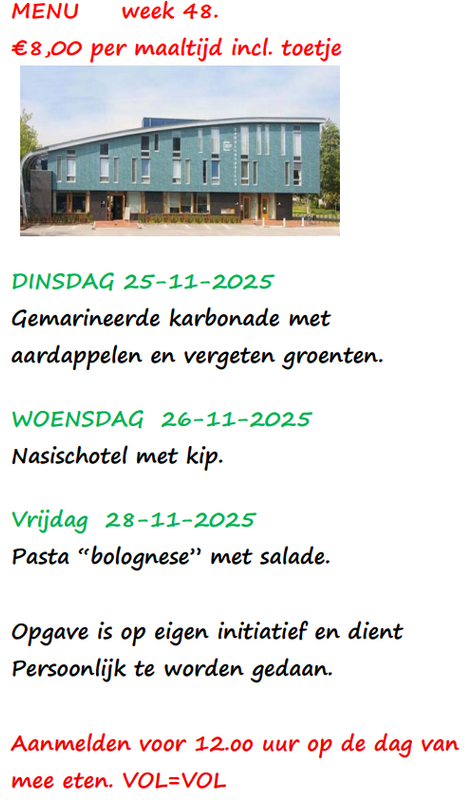 Aanmelden om te eten kunt u voor 12.00 uur doen van die zelfde dag. (Dit in verband dat de keuken moet weten voor hoeveel mensen er gekookt moet worden)