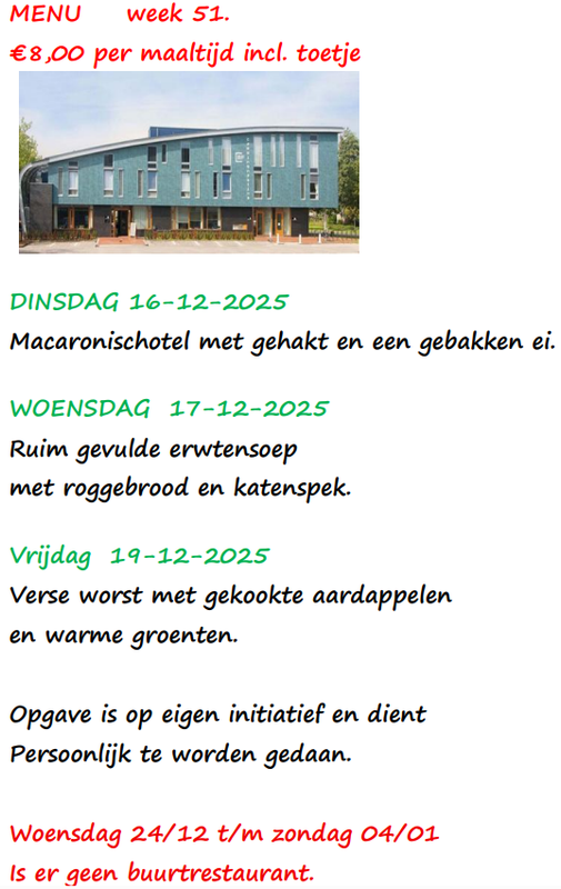 Ons Multifunctioneel centrum biedt u wekelijks de mogelijkheid om te genieten van een heerlijke maaltijd in ons restaurant, alvast smakelijk eten!
