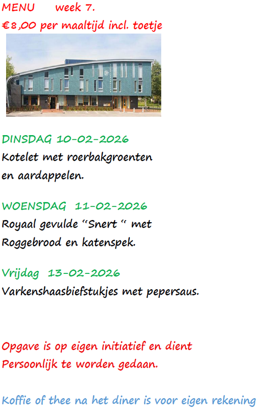 Ons Multifunctioneel centrum biedt u wekelijks de mogelijkheid om te genieten van een heerlijke maaltijd in ons restaurant, alvast smakelijk eten!