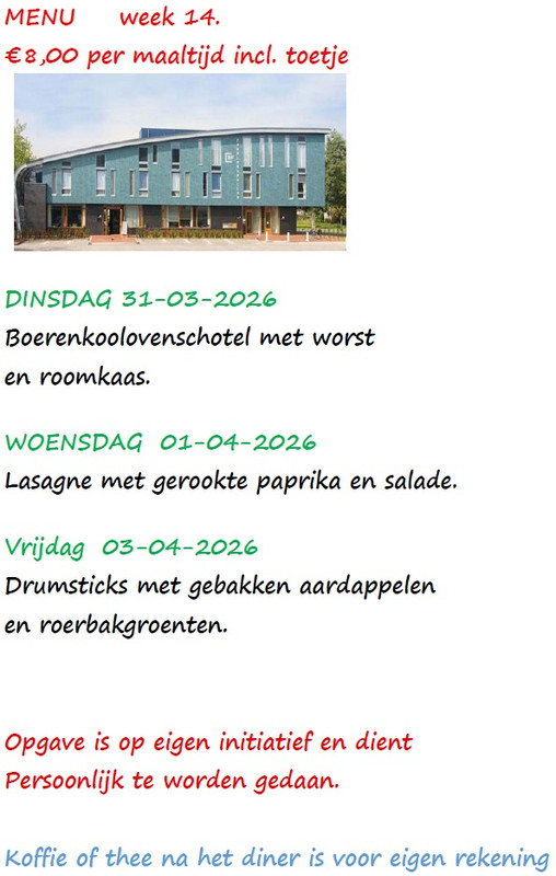 Aanmelden om te eten kunt u voor 12.00 uur doen van die zelfde dag. (Dit in verband dat de keuken moet weten voor hoeveel mensen er gekookt moet worden)