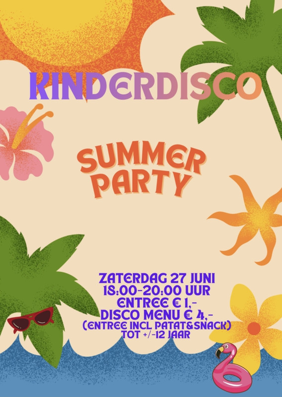 Zaterdag 27 Juni 2026 is er weer kinderdisco. Deze keer in het teken van de zomer. Iedereen is welkom!